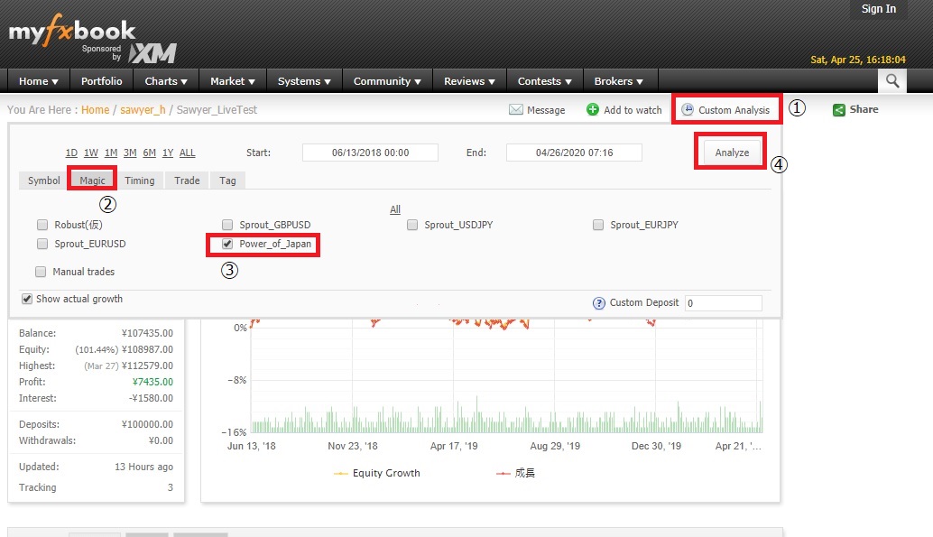 ②の「magic」の代わりにsymbol等の別の項目を選べば通貨毎や時間軸ごとの取引を確認することができますので、EAの動作確認のほかに自身の取引口座をmyfxbookに登録することで、自身の運用しているEAや裁量取引の中身をチェックすることができます。