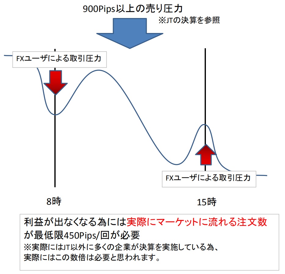 JTの決算報告書を確認し、1000億円のUSDJPYの売り圧力があることが分かりました。