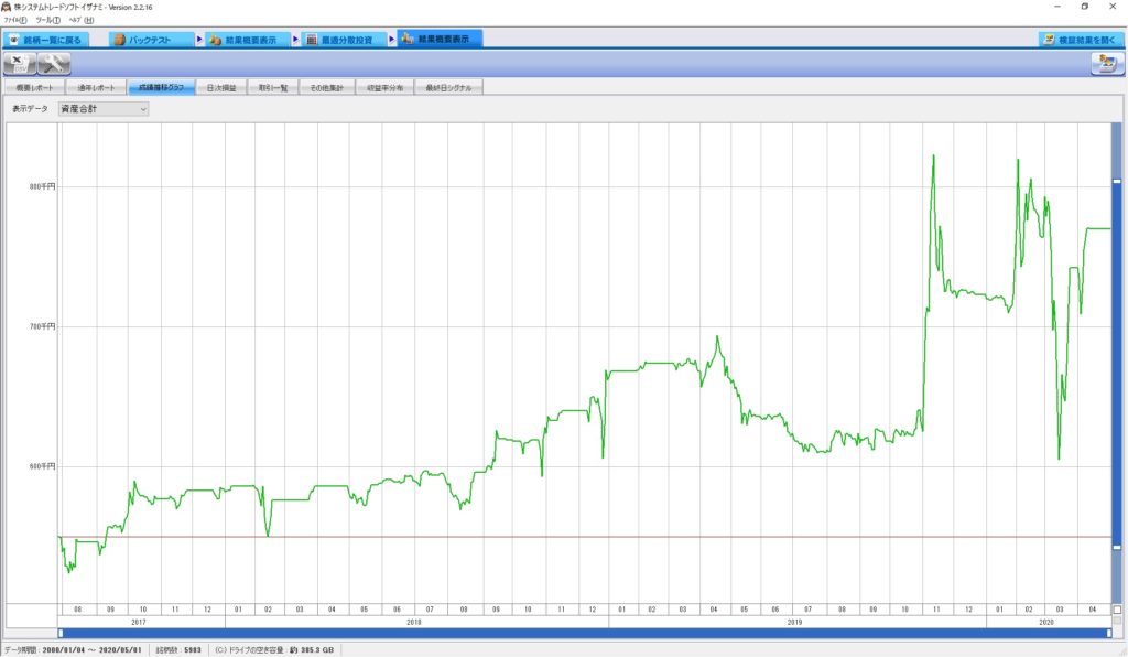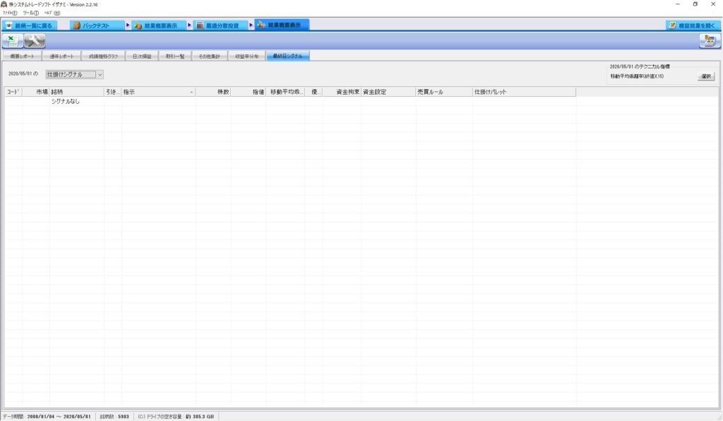 計算が終わりますと「概要レポート」「通年レポート」「成績推移グラフ」「最終日シグナル」等を確認することができます。