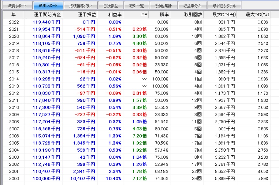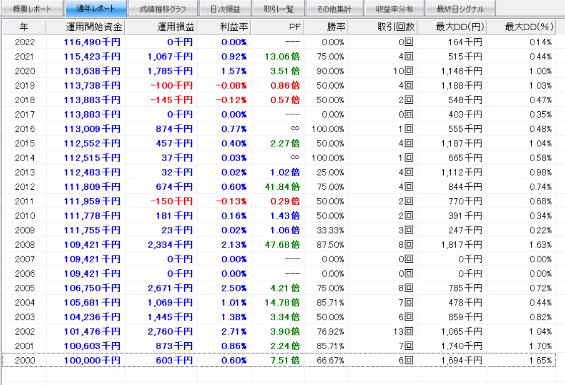 トレード機会は少ないものの、トレード単位の期待値が高いため期待を持てるルールと思います。